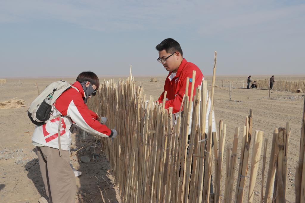 徐灿(右)在新疆和田地区皮山县参与治沙防沙工作(2024年11月26日摄)。
