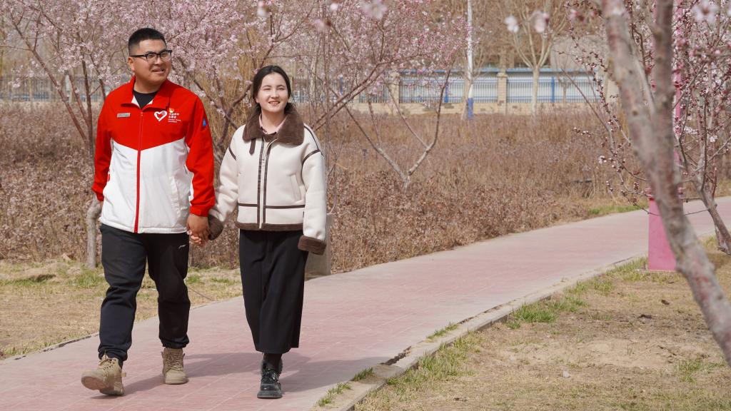 徐灿(左)与女友古丽苏姆·艾合麦提在新疆和田地区皮山县的公园散步(2025年3月19日摄)。