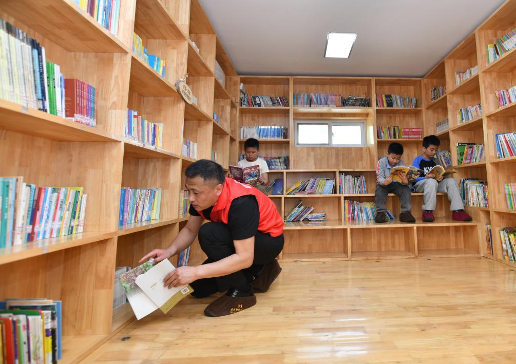 4月20日,吴玉良(前)在他负责管理的河北沧州渤海新区黄骅市一间社区书屋内整理图书。