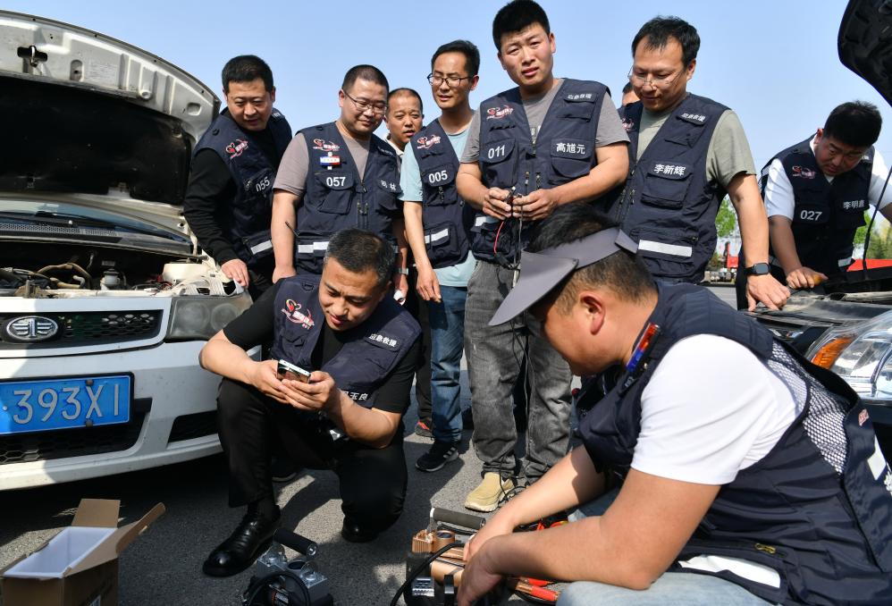 4月20日,吴玉良(前左一)和渤海魂应急救援队的伙伴们进行故障车辆救援演练。