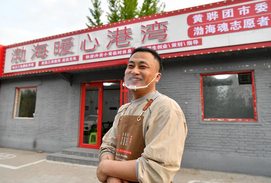 4月21日,吴玉良在河北沧州渤海新区黄骅市“渤海暖心港湾”门前迎接准备来吃早餐的环卫工人。