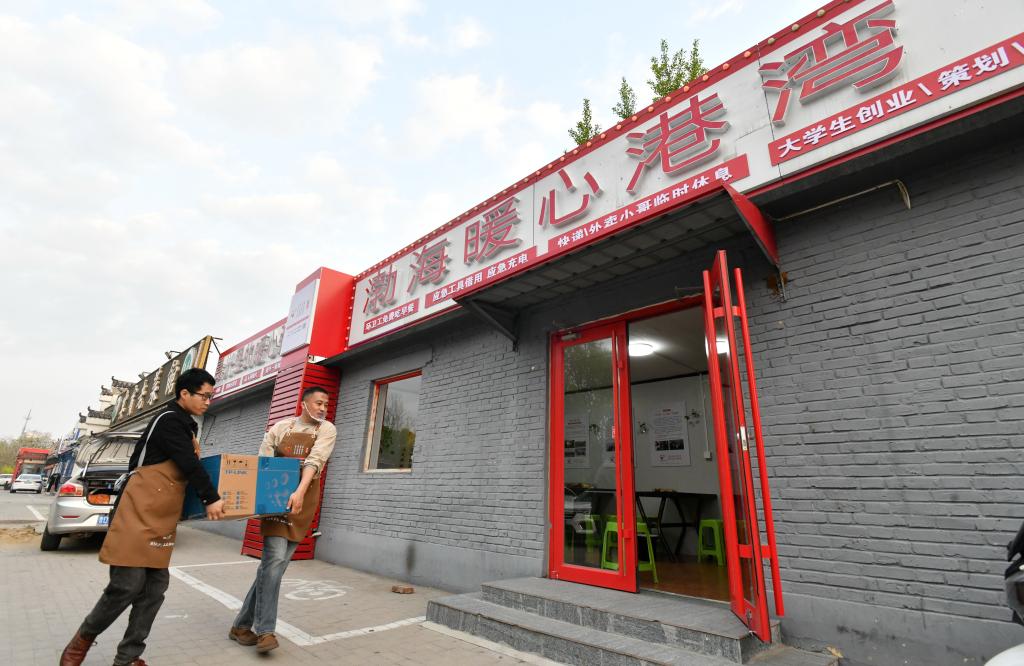 4月21日,吴玉良(右)和志愿者伙伴将采购的物品搬进河北沧州渤海新区黄骅市“渤海暖心港湾”。