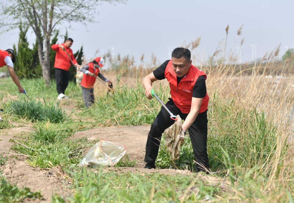 4月20日,吴玉良(前)和志愿者伙伴在河北沧州渤海新区黄骅市石碑河捡拾垃圾。