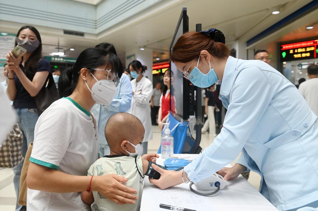 5月8日,在广西医科大学第一附属医院,医务人员在义诊现场提供测量血压服务。