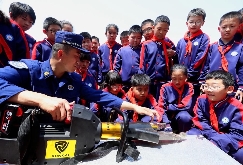 5月12日,山东省青岛市即墨区消防救援大队消防员在给即墨区书香小学的学生讲解破拆类救援设备的使用方法。