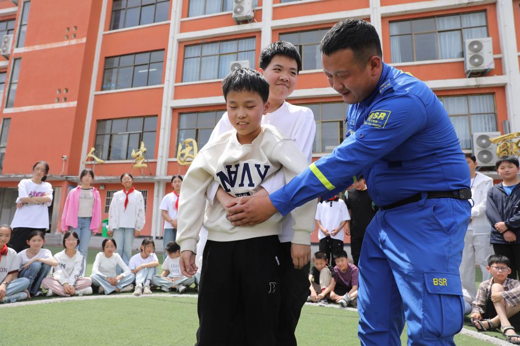 5月12日,在河南省焦作市温县城内小学,蓝天救援队志愿者在指导学生学习海姆立克急救法。