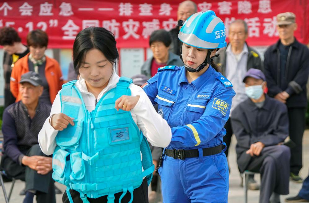 5月12日,蓝天救援队员在河北省遵化市苏家洼镇小王庄村帮助村民试穿救生衣。
