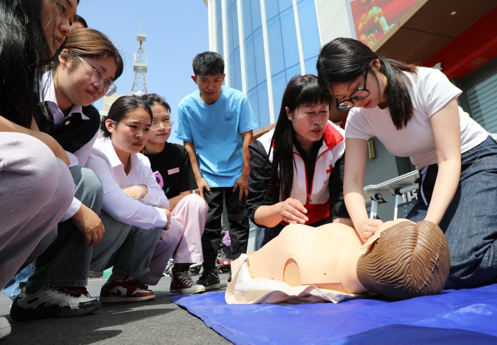 5月12日,在山东省滨州市博兴县“全国防灾减灾日集中宣传活动”现场,博兴县红十字会志愿者指导人们学习心肺复苏急救知识。