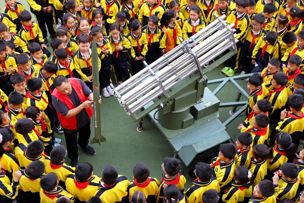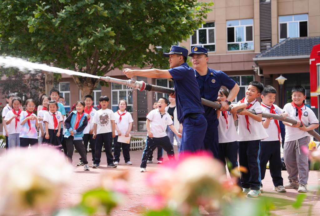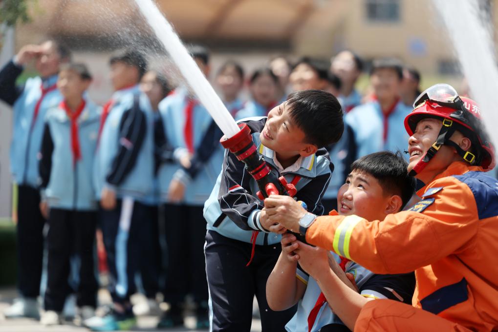 5月12日,在河北省石家庄市北郡小学,石家庄市新华区消防救援大队消防员为学生们展示高压灭火水枪。