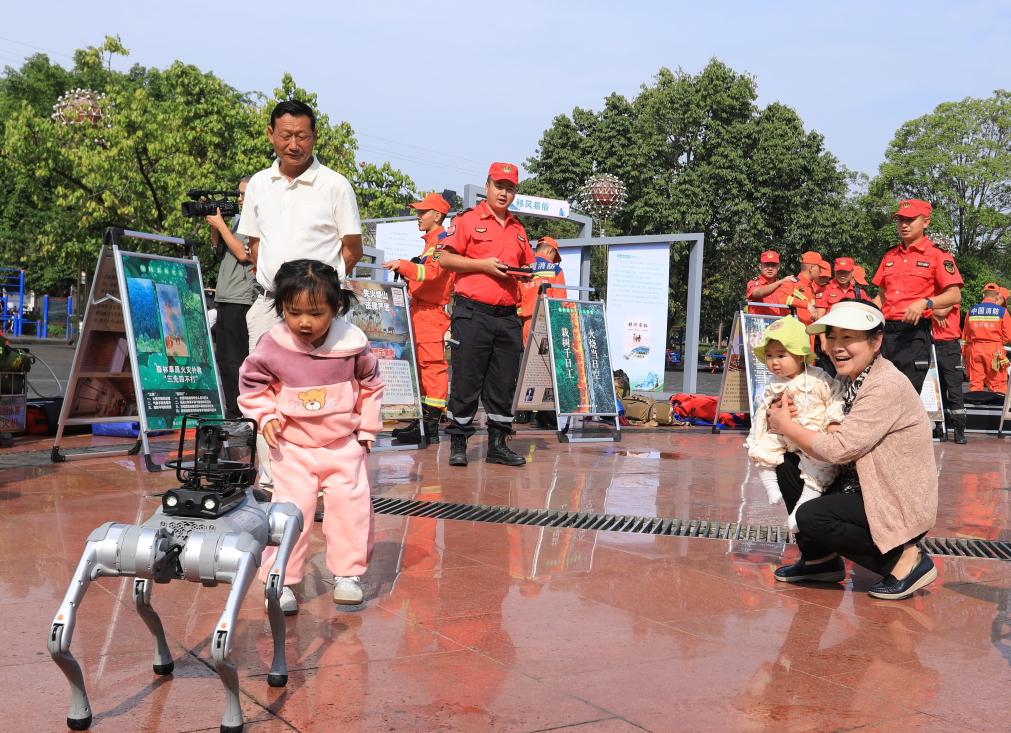 5月12日,在云南省腾冲市防灾减灾主题宣传教育活动现场,市民和救援机器狗互动。