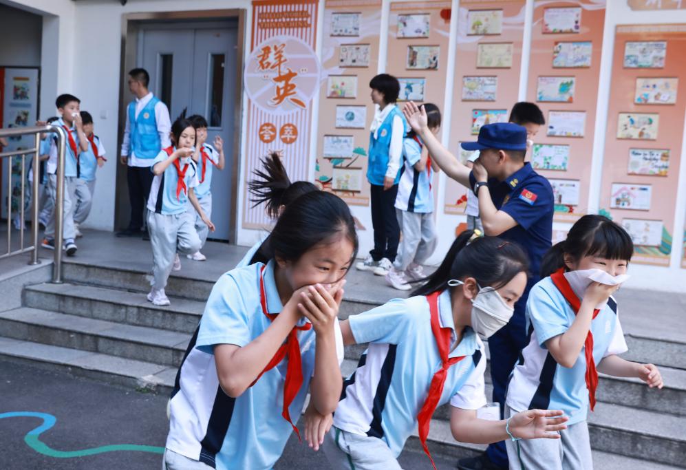 5月12日,武汉市未来实验小学美林校区小学生进行火灾疏散逃生演练。