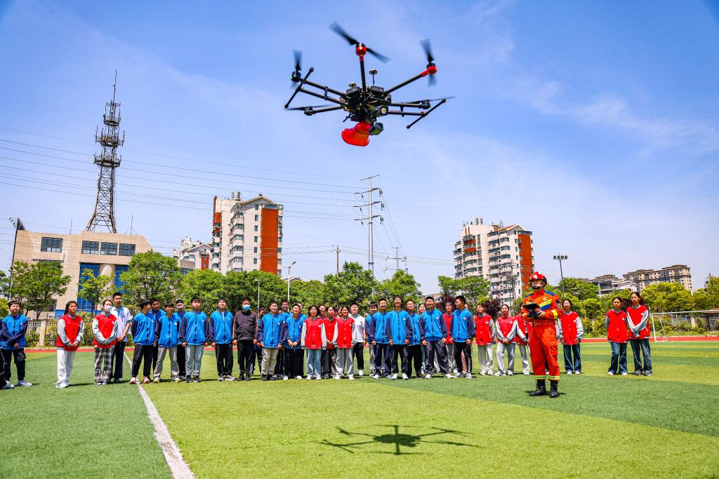 5月12日,在江苏省扬州市江都区第二中学,扬州市江都区消防救援大队消防员给学生演示消防职业技能。