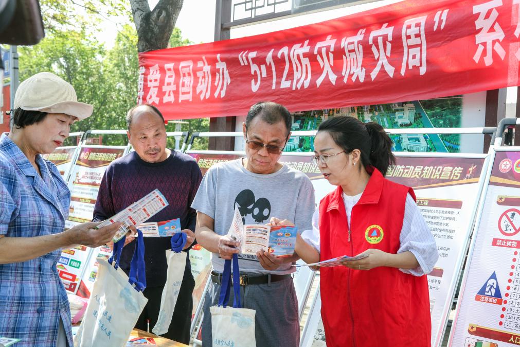 5月12日,在河南省焦作市博爱县人民公园,志愿者向市民宣传防灾减灾知识。