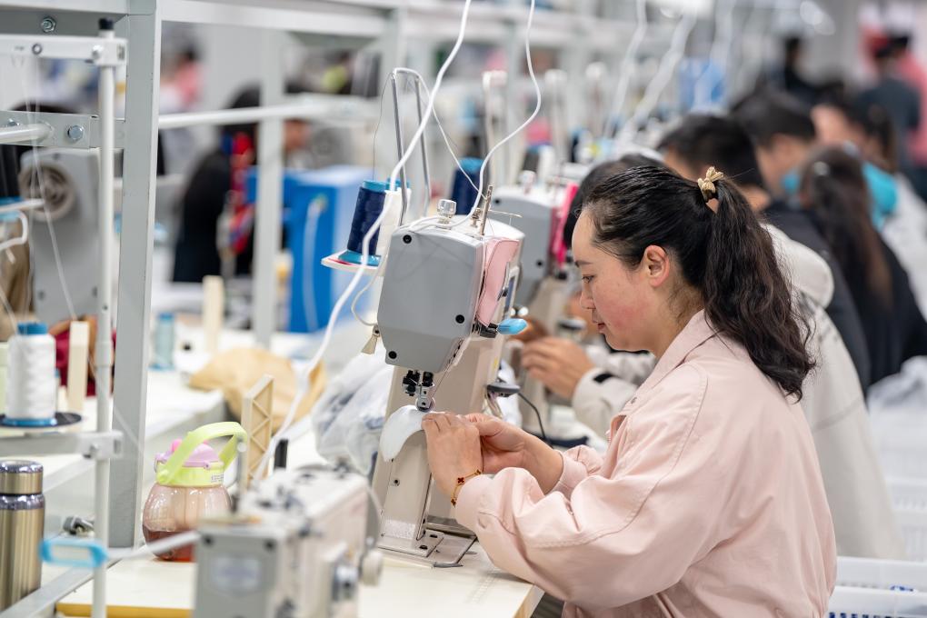 5月13日,云南省昭通市镇雄县居民在镇雄纺织服装产业园制作防晒服。