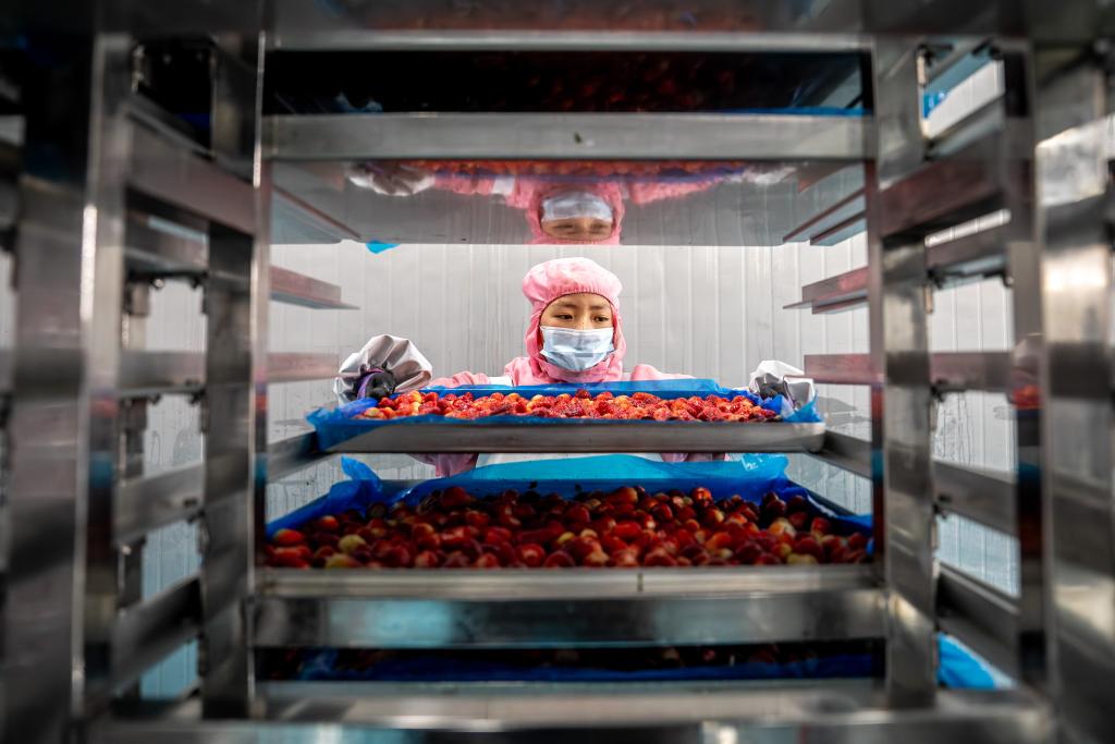 5月15日,在巧家县马树镇草莓深加工厂,工人将清洗好的草莓装盘,准备放入冷柜速冻。