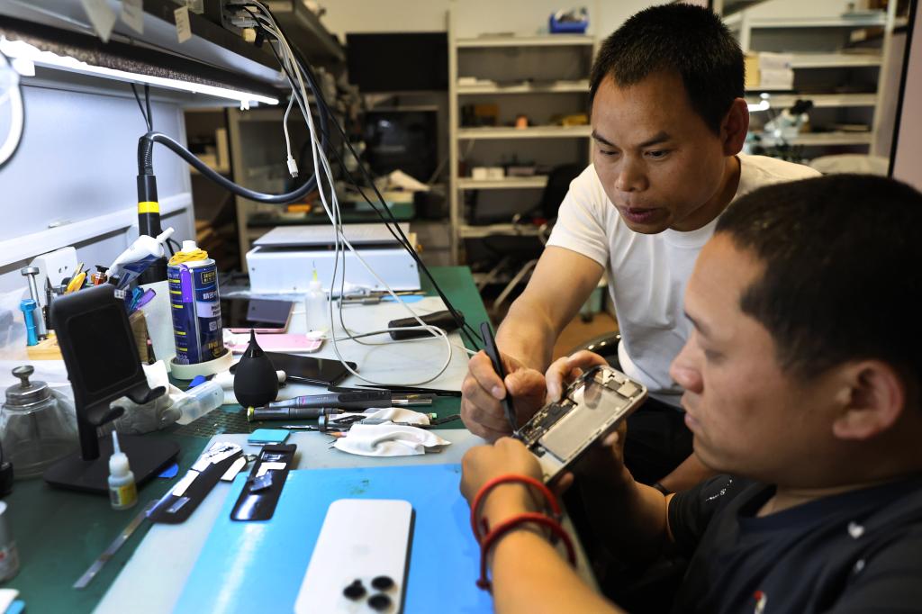 5月17日,柯水昌(左)查看朋友送修的一部摔坏的手机。