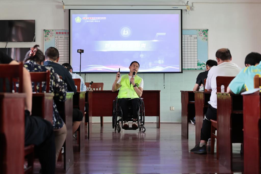 5月13日,柯水昌在上海奉贤区南桥镇一个阳光之家教室内为学员讲解手机使用中遇到的问题。