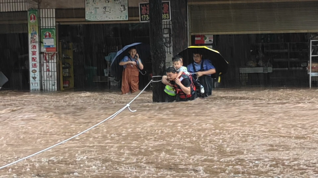 22日上午,桃源县佘家坪镇集镇街道被淹,一民房内有老人和儿童被困。桃源县公安局佘家坪派出所全体民辅警迅速奔赴抗洪一线,他们趟着湍急水流,在齐腰深的洪水中依靠一根绳索徒步转移老人和小孩。
