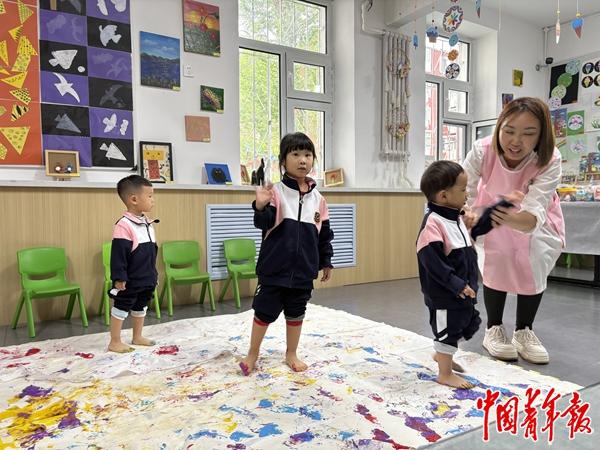 5月14日上午,哈尔滨锅炉幼儿园内,孩子们用脚丫在纸上“作画”。中青报·中青网记者 刘昶荣/摄