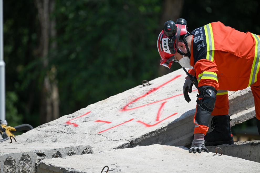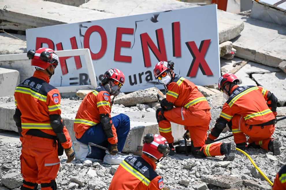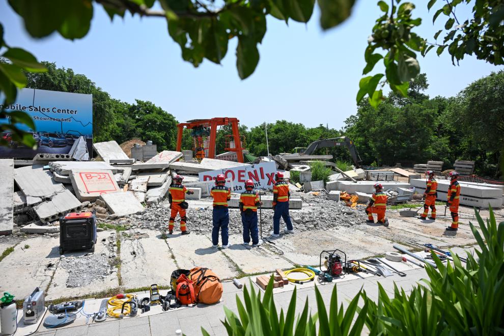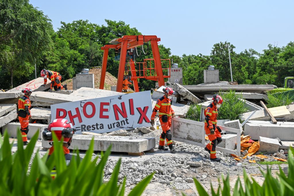 5月28日,中国救援队在位于北京的国家地震紧急救援训练基地进行地震搜救演练。