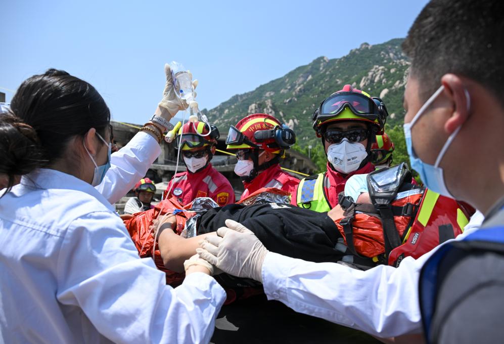 5月28日,中国国际救援队在位于北京的国家地震紧急救援训练基地进行地震搜救演练,这是队员在“地震现场”利用转运系统将“幸存者”从高处斜向转移至地面。