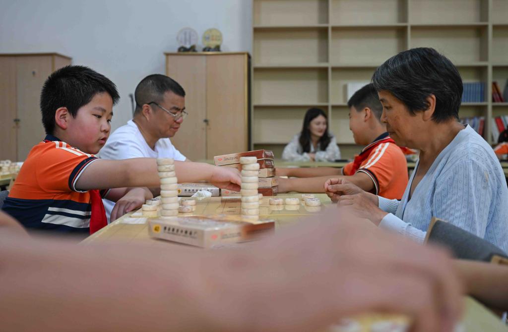 5月29日,重庆市垫江县凤山小学学生在凤山公园家校共育学习点与家长下象棋。