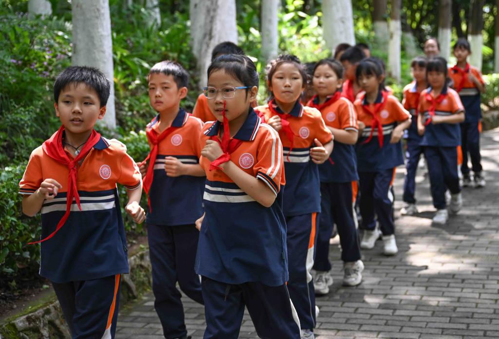 5月29日,重庆市垫江县凤山小学学生在凤山公园跑步。
