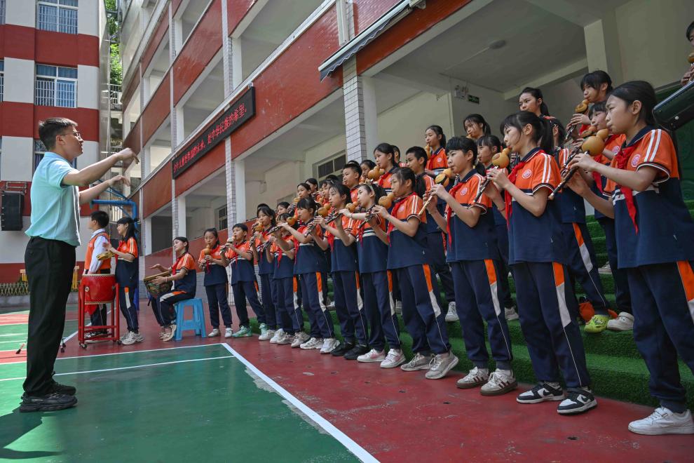 5月29日,重庆市垫江县凤山小学学生在老师的带领下演奏葫芦丝。