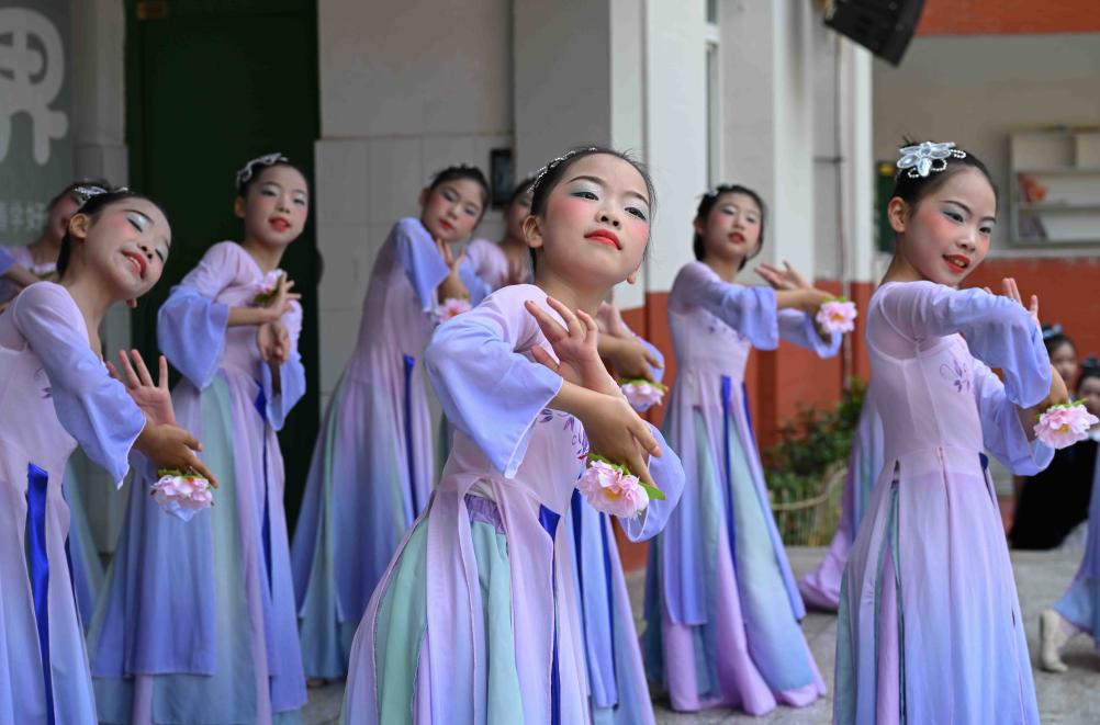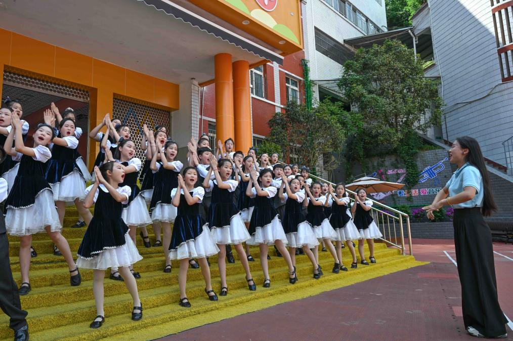 5月29日,重庆市垫江县凤山小学学生在校园内练习舞蹈。