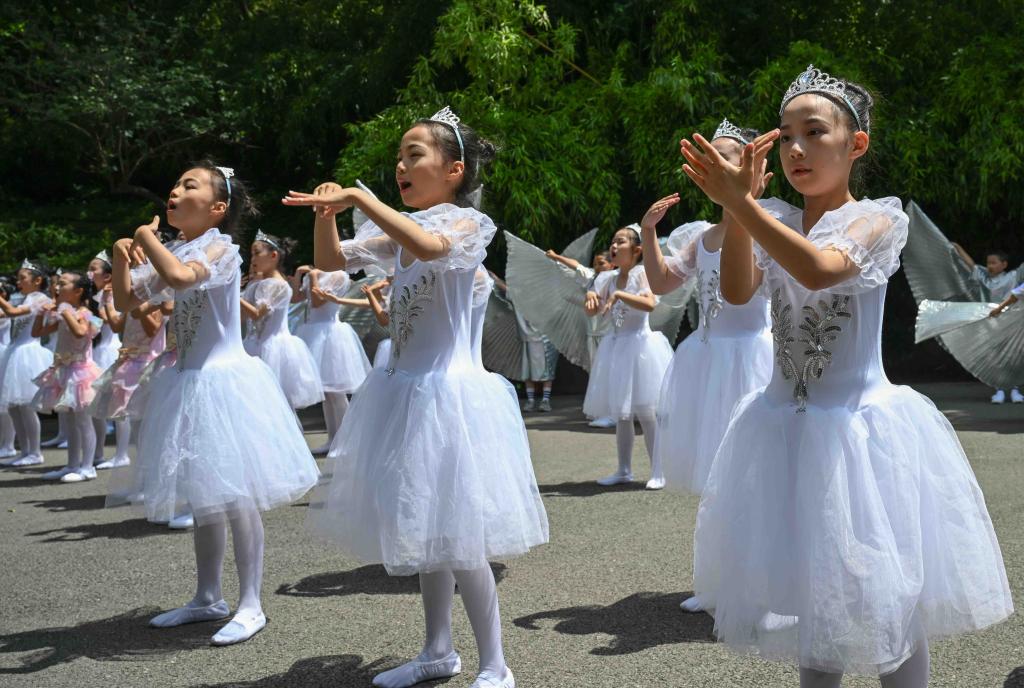 5月29日,重庆市垫江县凤山小学学生在凤山公园练习舞蹈。