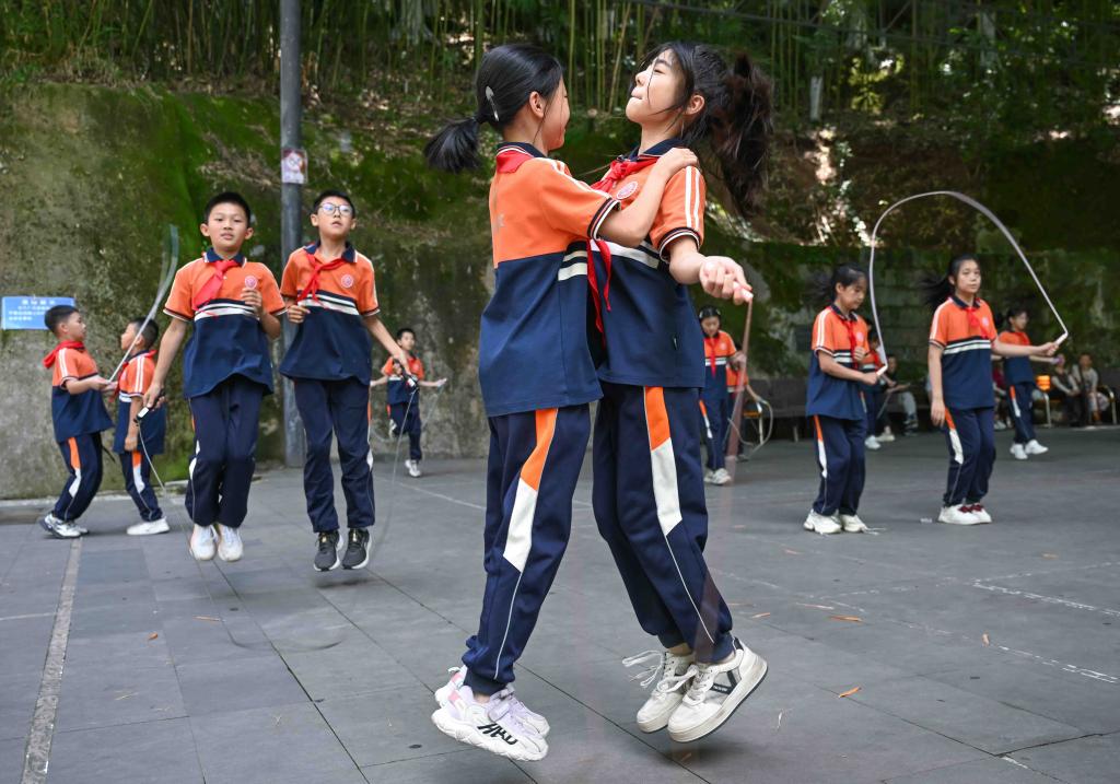 5月29日,重庆市垫江县凤山小学学生在凤山公园练习花式跳绳。
