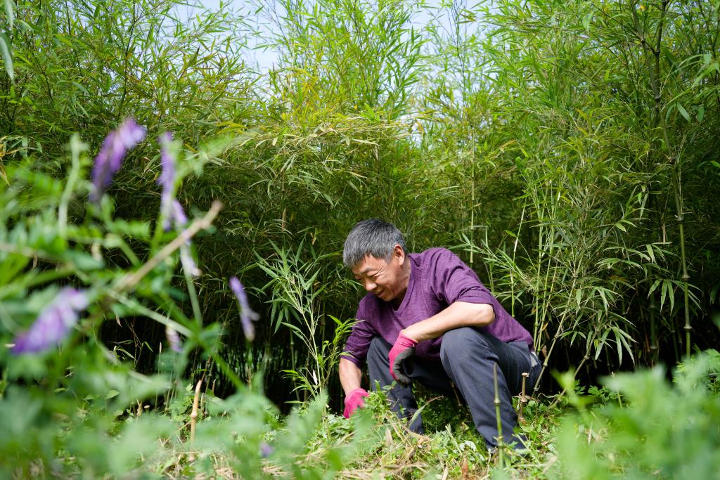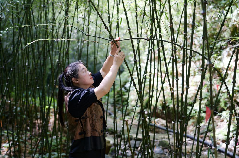 5月29日,云南羲之竹文化科技有限公司工作人员欧贤芹查看筇竹长势。
