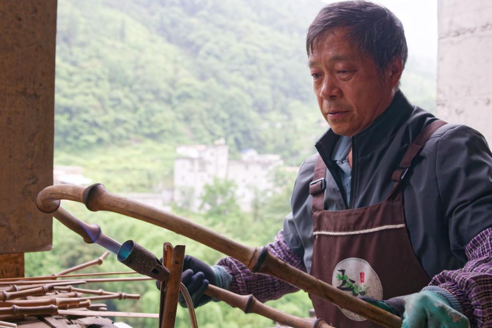 5月28日,工人在位于大关县木杆镇的云南羲之竹文化科技有限公司的一处加工厂加热筇竹塑形。