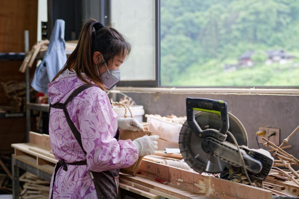 5月28日,工人在位于大关县木杆镇的云南羲之竹文化科技有限公司的一处加工厂制作家具。