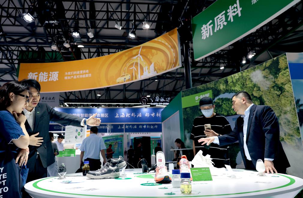6月5日,工作人员在一组新材料应用产品展示台前向参观者做介绍。