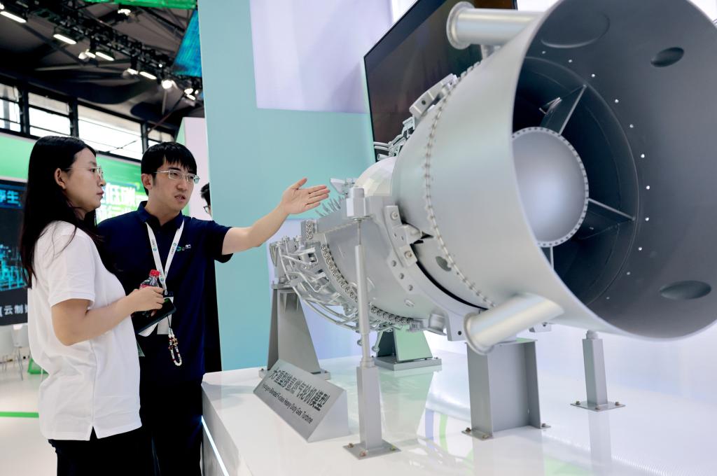 6月5日,工作人员(右)在一个重型掺氢燃气轮机模型旁向参观者做介绍。