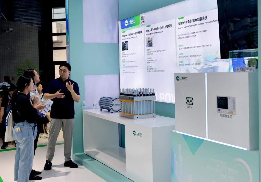 6月5日,工作人员(右)在向参观者介绍电解槽制氢设备。
