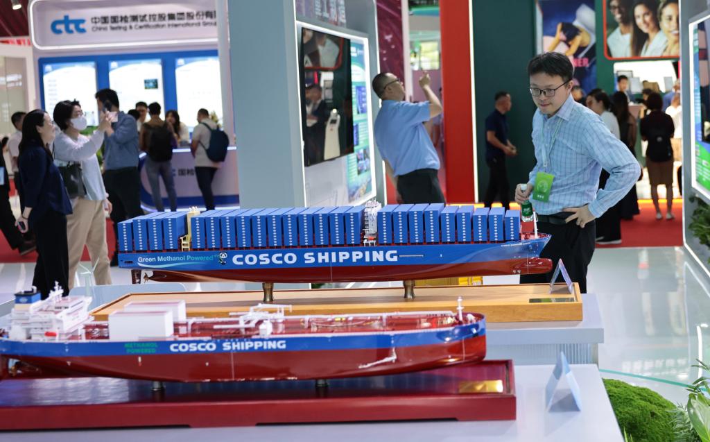 6月5日,参观者在一个甲醇双燃料动力集装箱船模型前驻足观看。
