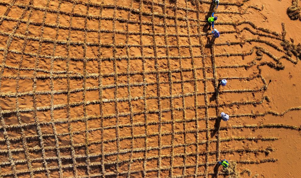草方格沙障是治沙技术中的典型代表,用麦草、稻草、芦苇等材料,在流动沙丘上扎设成方格状的挡风墙,增加沙地表面的粗糙度,削减风力,使之无力携走疏松的沙粒。低覆盖度治沙技术的理论依据则是“仿生学”与“点格局”原理,营造适宜当地自然植被覆盖度的固沙林。