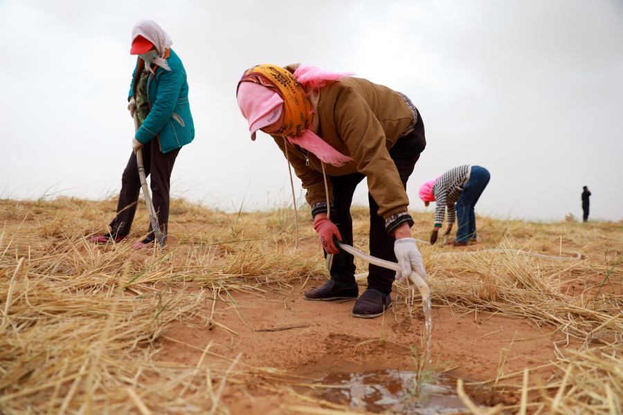 新华社兰州6月16日电(记者郭刚、程楠)南风掠过,沙漠之上,片片草木摇曳生姿,一场与风沙的无声“战役”仍在持续——挖坑补种树苗、植草浇水的身影穿梭其间,为这片曾经的荒芜之地再添新绿。