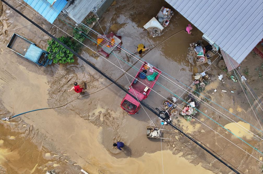 6月25日,在广西三江侗族自治县梅林乡梅林村,村民在清理淤泥(无人机照片)。