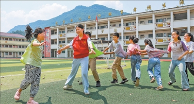 图为7月8日,大学生志愿者和孩子们一起玩“老鹰抓小鸡”游戏。