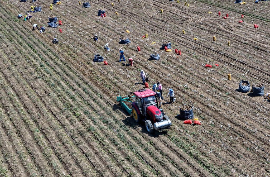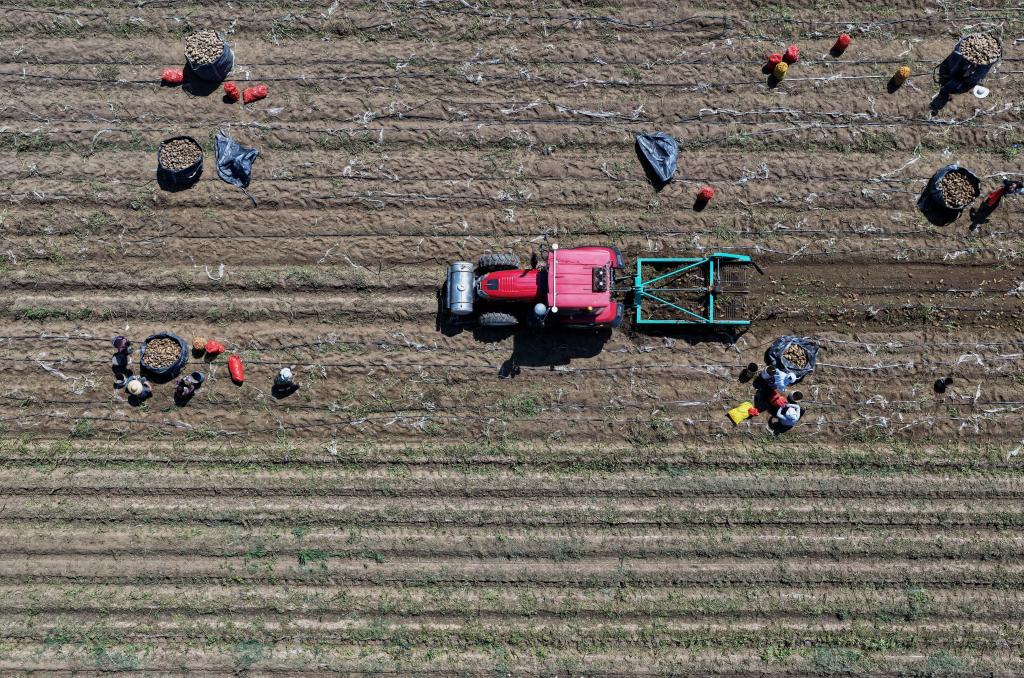 7月9日,河北省唐山市丰南区大新庄镇大岭子村的农民在田间收获马铃薯(无人机照片)。