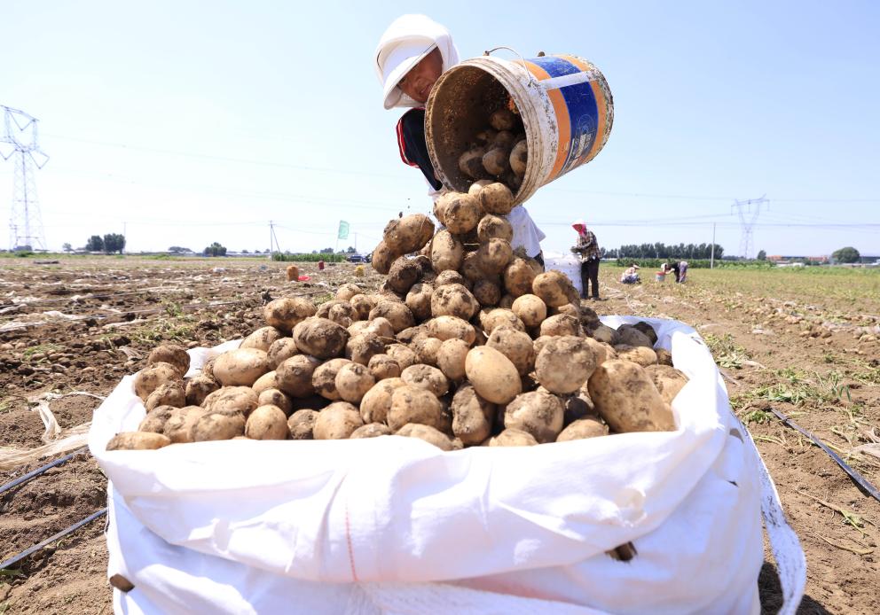 7月9日,河北省唐山市丰南区大新庄镇大岭子村的农民在田间收获马铃薯。