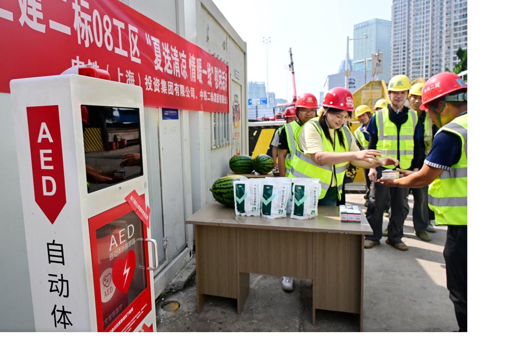 7月11日,在中铁二局青岛地铁5号线青医东站项目工地,工人在领取降温药品。