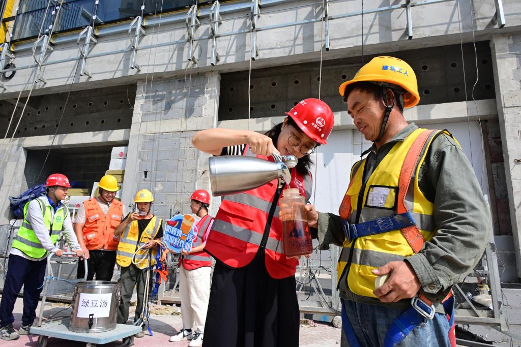 7月11日,在中铁建工青岛国际邮轮港区航运中心项目工地,外墙安装工姜广生(右一)在作业间歇接受工友送来的绿豆汤。