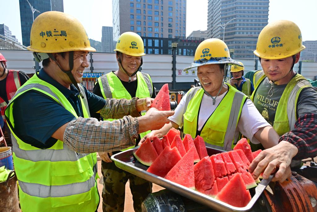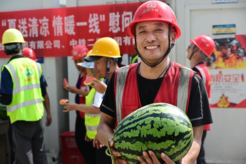 7月11日,在中铁二局青岛地铁5号线青医东站项目工地,工人在作业间歇领取西瓜。