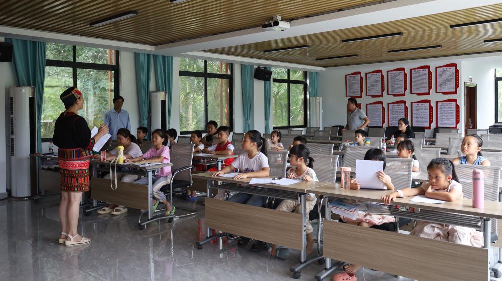 海南省五指山市畅好乡的爱心托管站中,头戴黎锦编织头巾、身着黎族筒裙的黎族民歌代表性传承人朱燕荣正教孩子们唱民歌《放牛谣》,此时22个孩子也目不转睛地看着讲台上的老师和手中的曲谱。