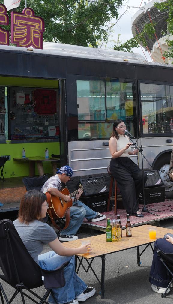 7月17日,在位于椒江区葭沚街道的野菜青年创业基地,迷岛乐队在他们开的音乐酒馆外为游客演出。