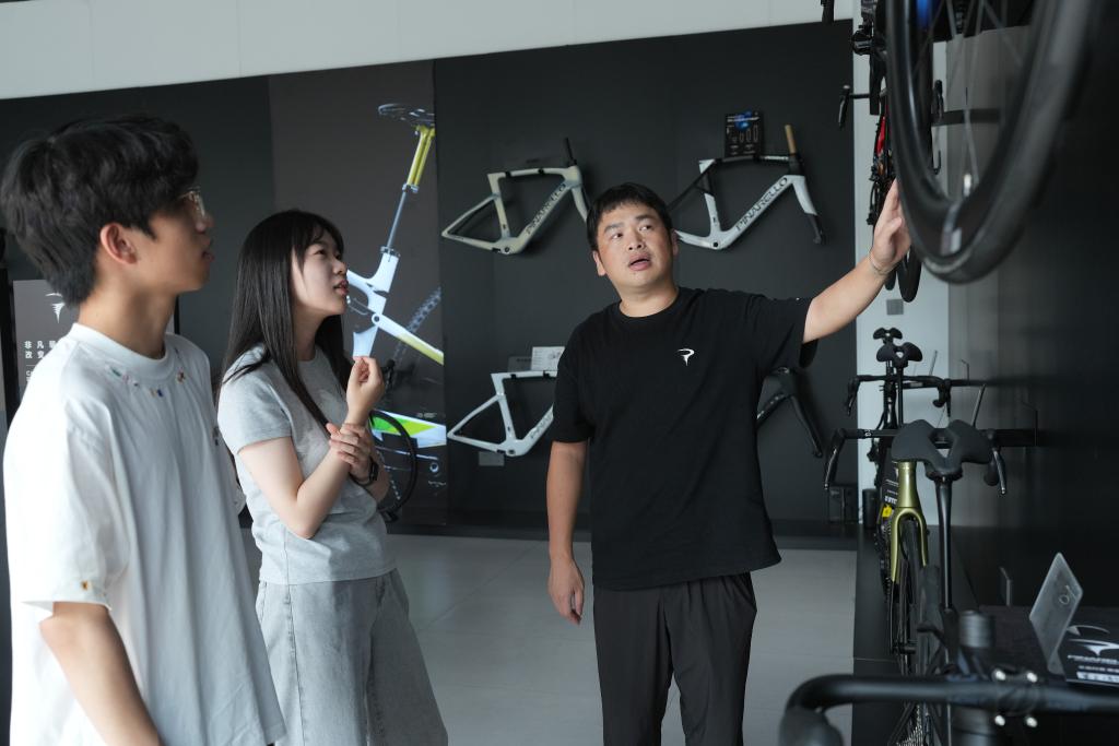 7月17日,在位于椒江区葭沚街道的野菜青年创业基地,创业青年林健(右)给客户介绍公路自行车。